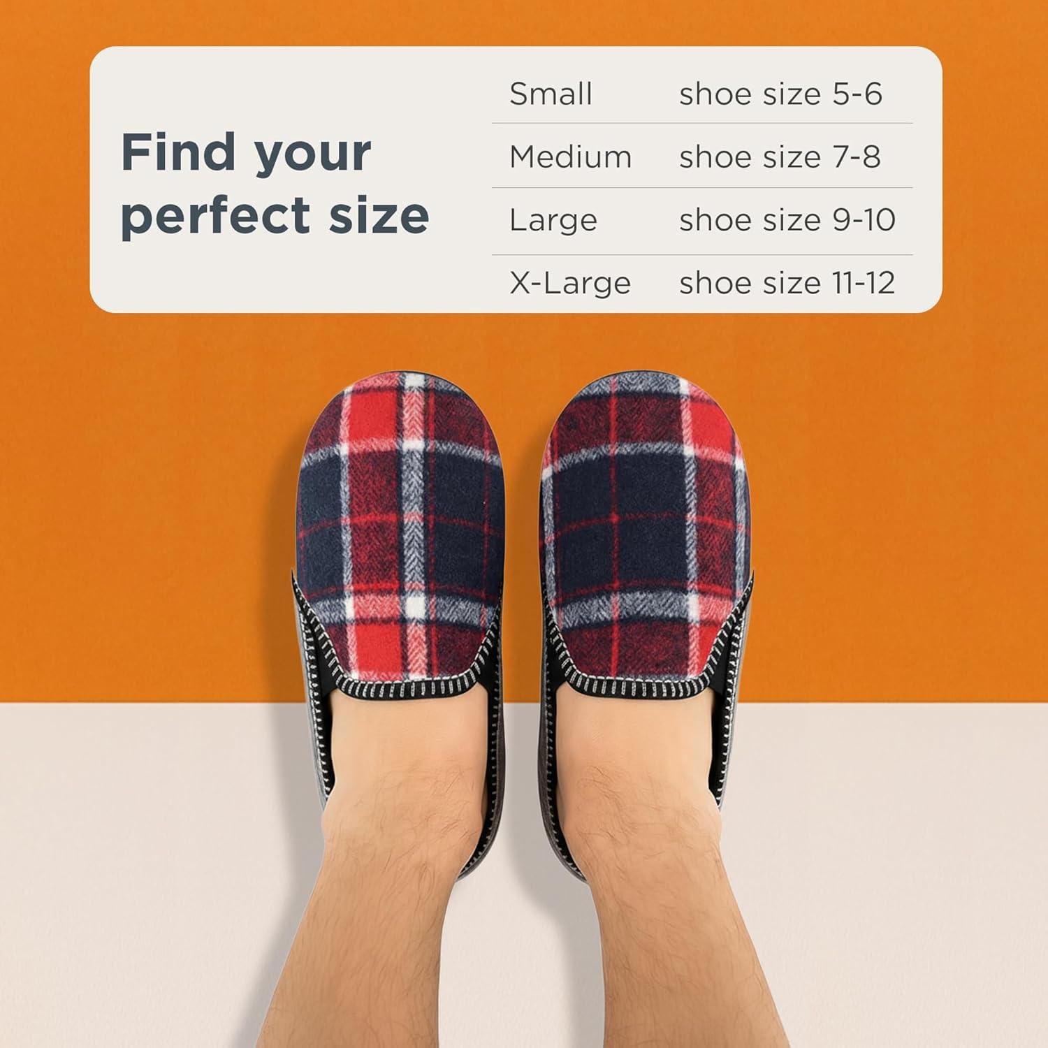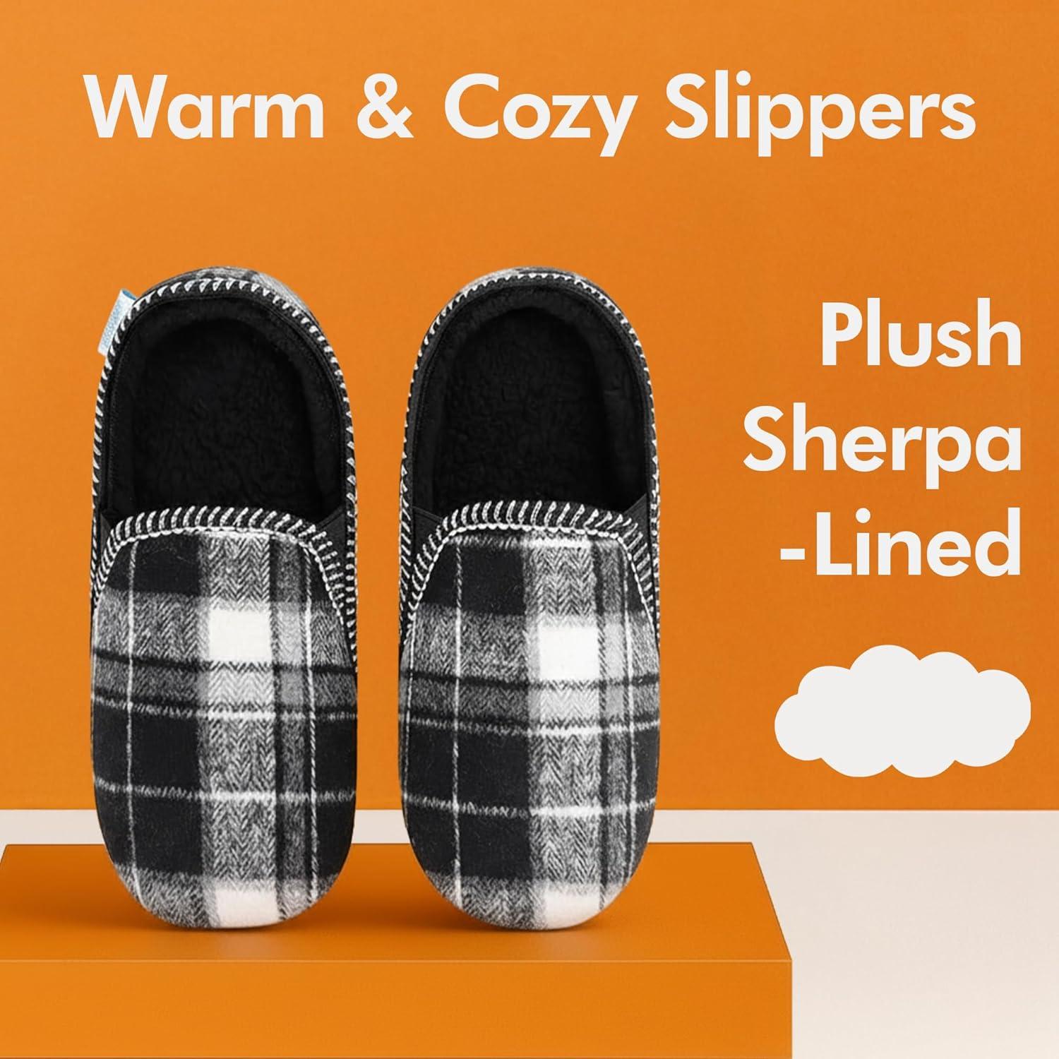 Bedroom Slippers for Men with Memory Foam: Warm slippers for men boast a classic brushed plaid upper with contrast whipstitching along the collar for stylish contrast. Memory foam insole offers responsive cushioning and increased comfort