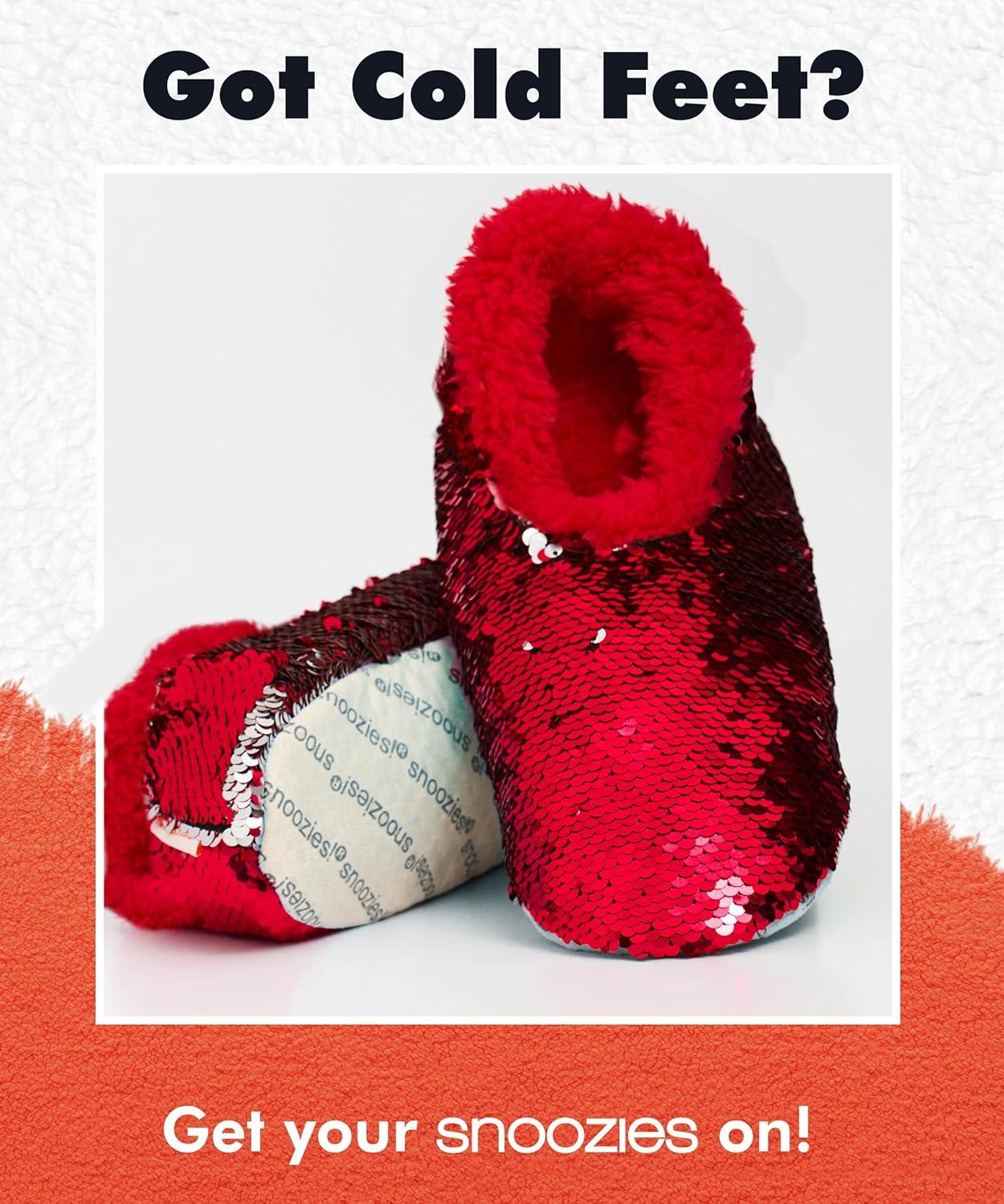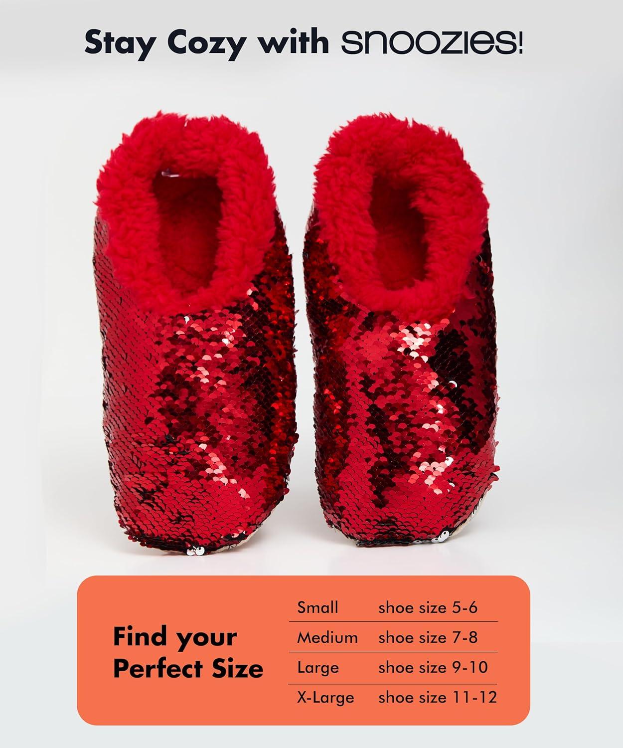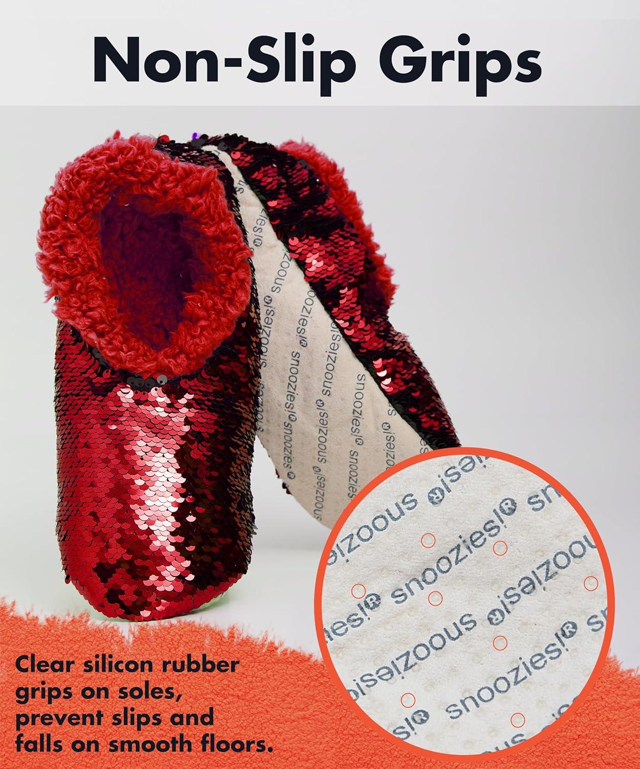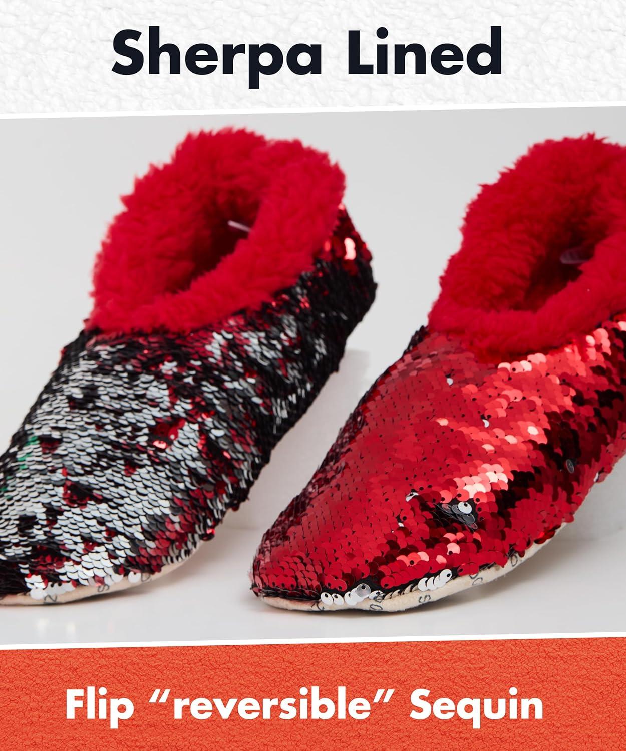 Snoozies Sequin Slippers for Women – Fancy Glitters, Comfy and Cozy Sparkly Non-Slip Womens Slippers Socks(Red/Silver)
