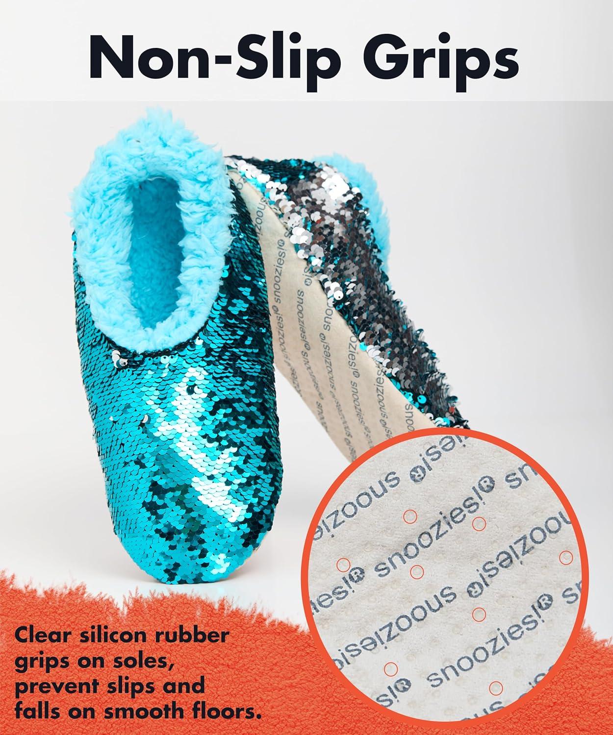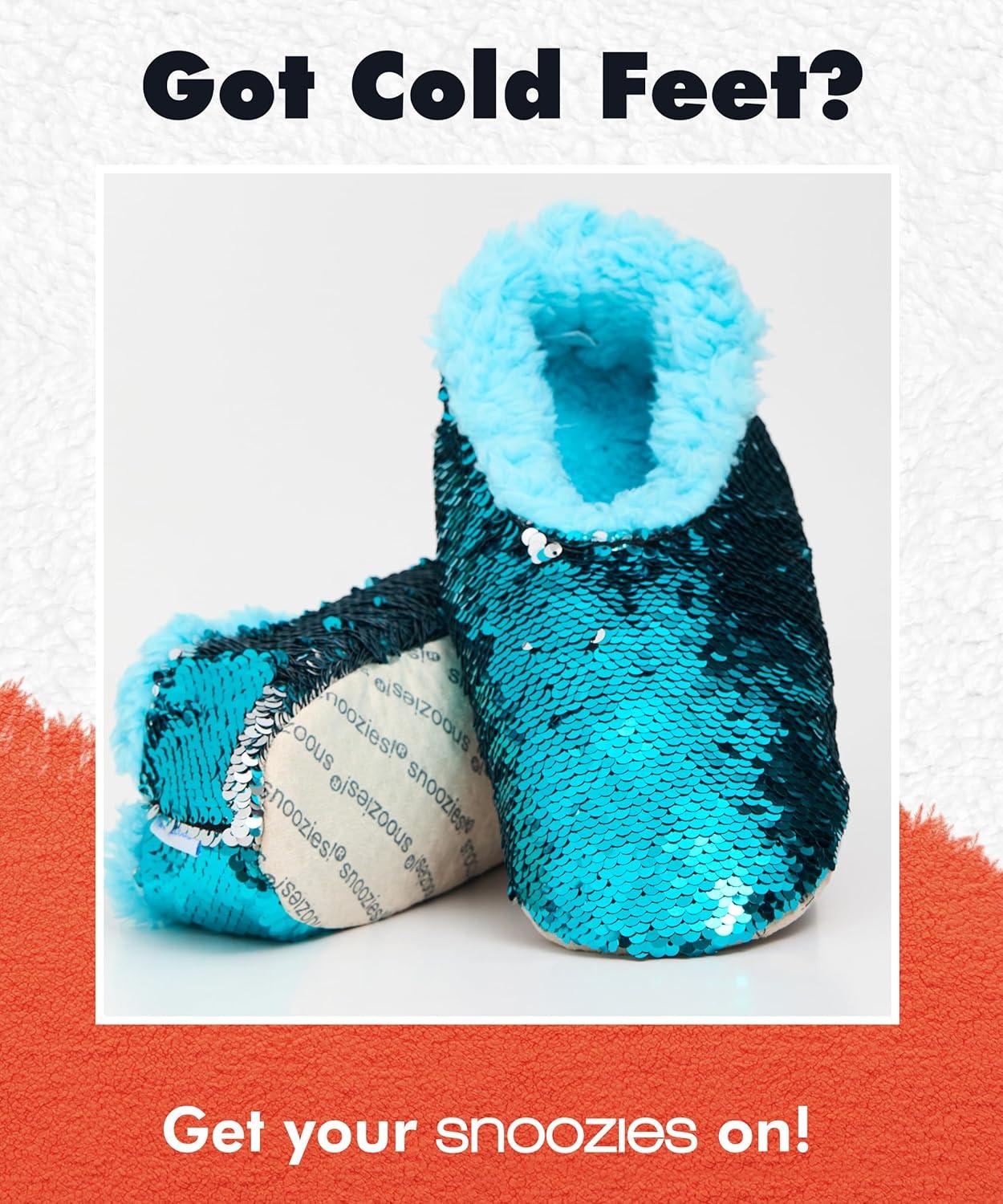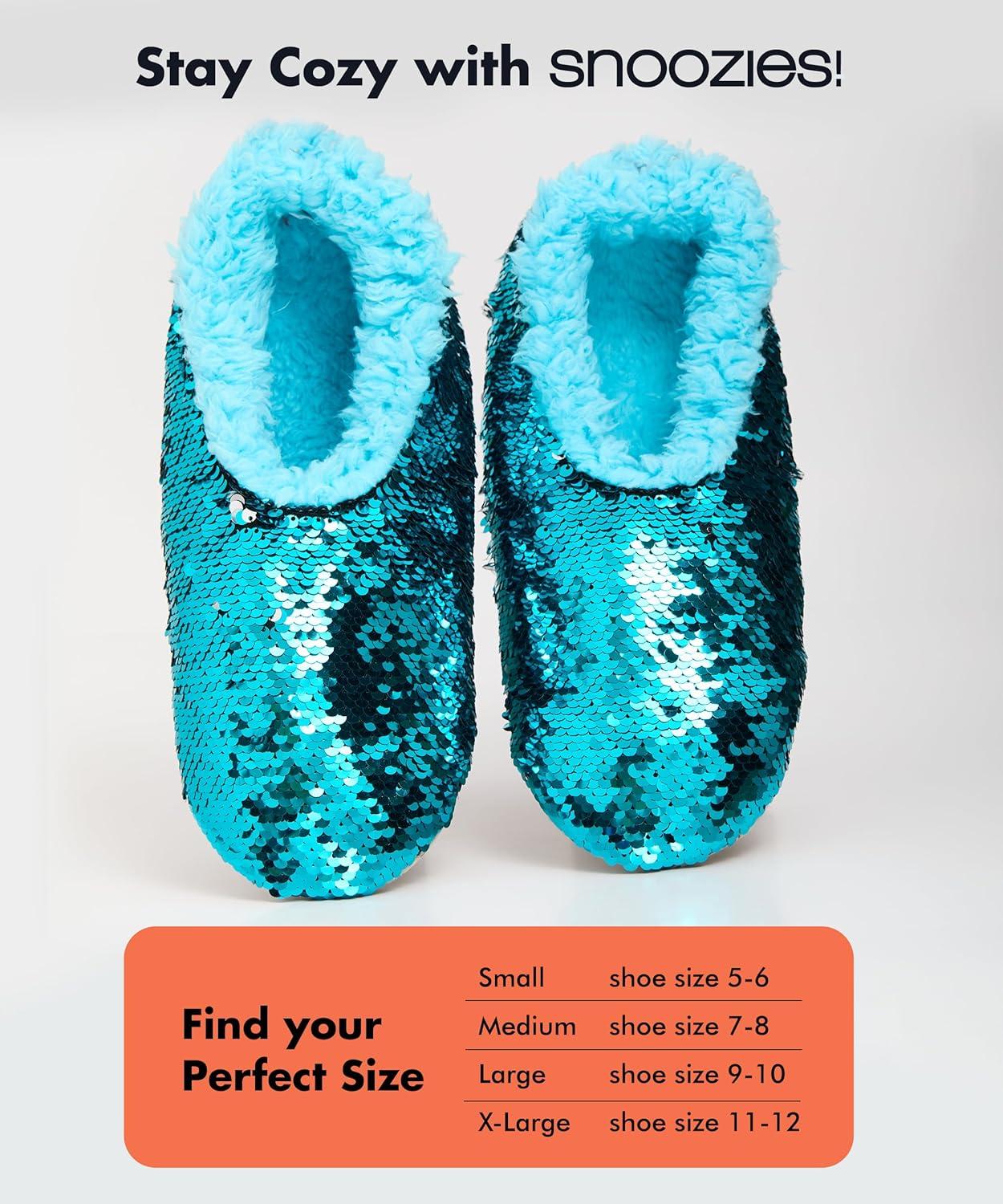 Snoozies are not a sock and not a slipper, it is a cross between the two, making them a foot covering or Footie! Made of 100% Polyester. Snoozies include white soft fleece lining inside, overall print on the outside, and a non-skid sole on the bottom.