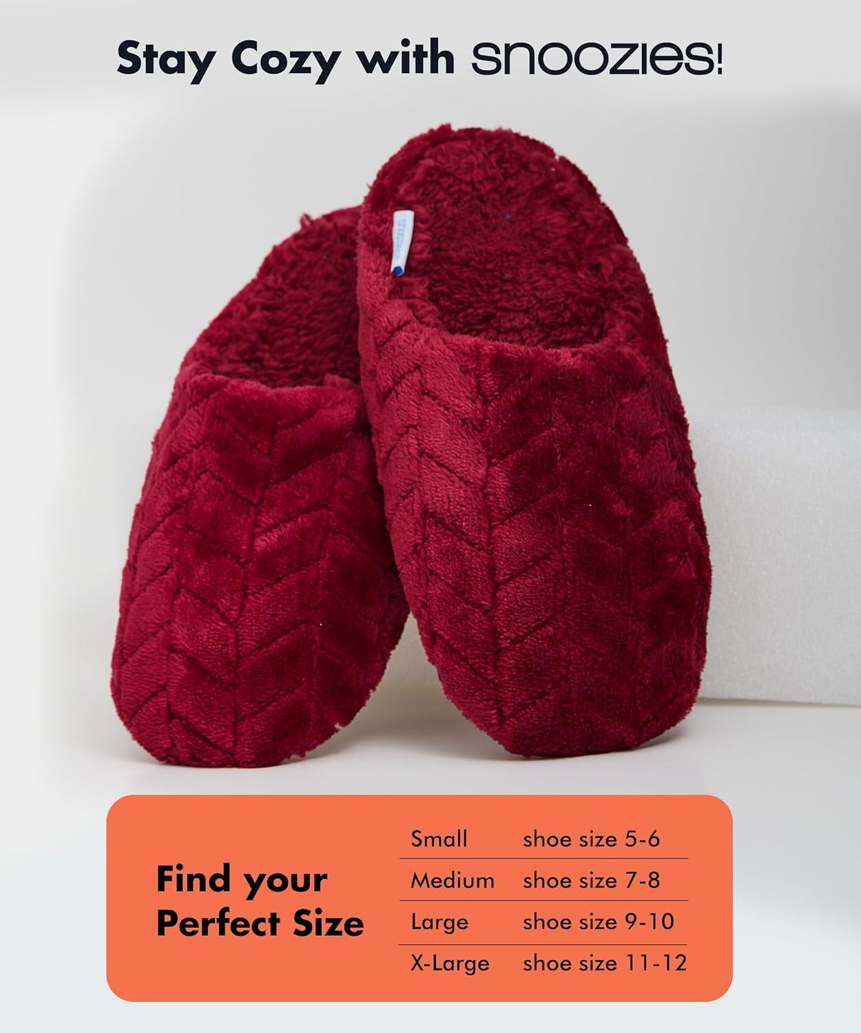 Snoozies Women's Slippers Size Guide: Small (Women's US Shoe Size 5-6), Medium (7-8), Large (9-10), and X-Large (11-12).