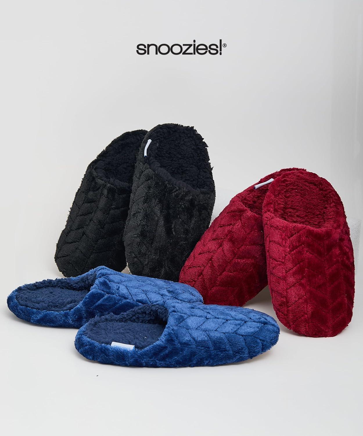 The house shoes are designed with a non-skid outsole that includes tiny rubber grippers and a Snoozies logo on the sole.